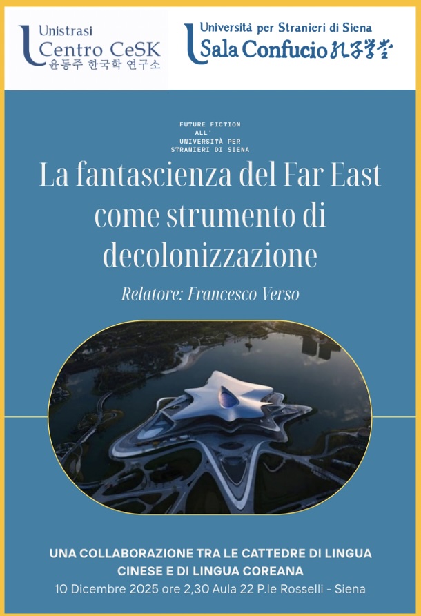 Francesco Verso è un autore e editore indipendendente della casa Editrice Future Vision, che ricerca e pubblica autori e autrici di fantascienza in traduzione originale da lingue asiatiche: cinese, coreano, giapponese, hindi, nepali….Questo è un incontro di grande stimolo per i nostri studenti e le studentesse, soprattutto coloro che si avvicinano al mondo editoriale e delle traduzioni in italiano da lingue asiatiche. Una riflessione da un autore e editore molto conosciuto e riconsciuto anche in Cina e in Corea, per guardare alla fantascienza come spazio di agency e di proiezioni visionarie e creatività di tempi lontani.
