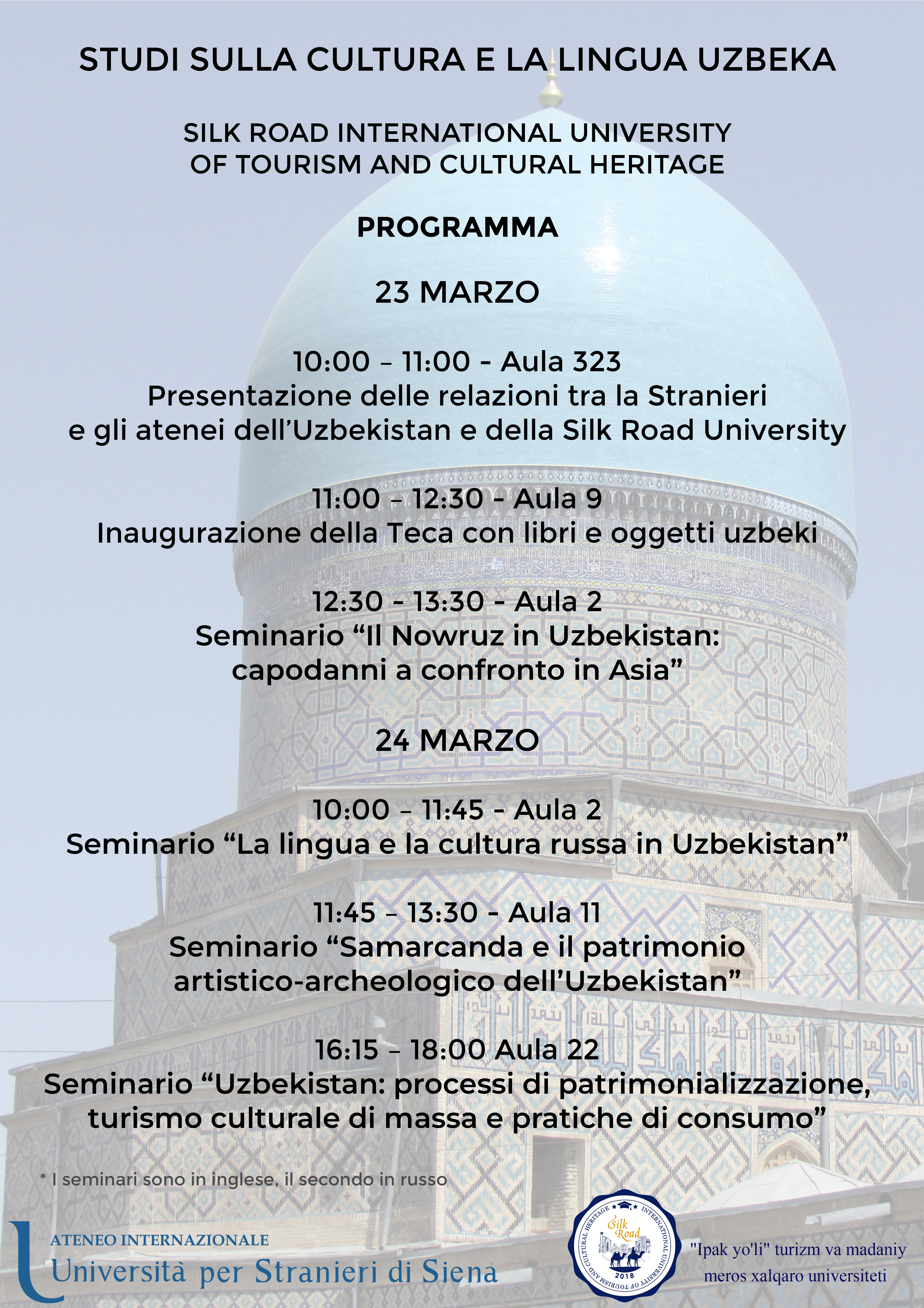 I seminari, aperti alla comunità universitaria e a chiunque sia interessata/o, si terranno in lingua inglese; quello su “La lingua e la cultura russa in Uzbekistan” prevede anche l’uso della lingua russa.