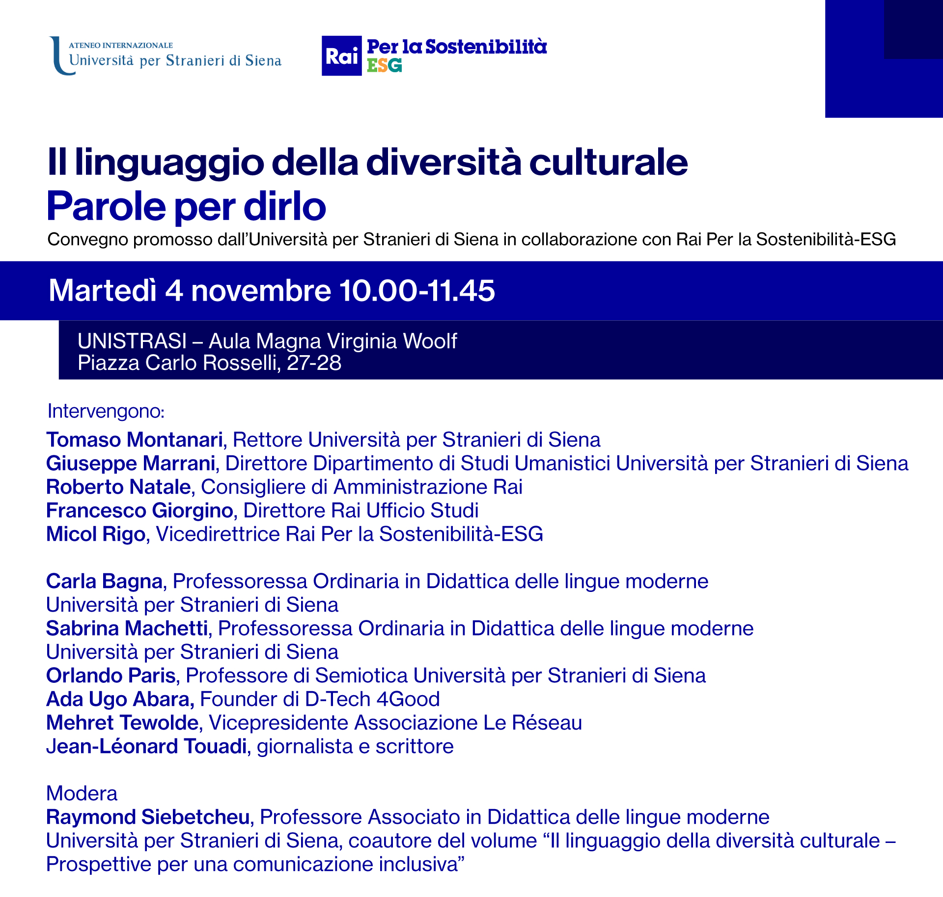 Apriranno l’evento i saluti istituzionali di Tomaso Montanari, Rettore dell’Università per Stranieri di Siena; Giuseppe Marrani, Direttore del Dipartimento DISU; Roberto Natale, Consigliere di Amministrazione Rai; Francesco Giorgino, Direttore Rai Ufficio Studi e Micol Rigo, Vicedirettrice Rai Per la Sostenibilità-ESG.