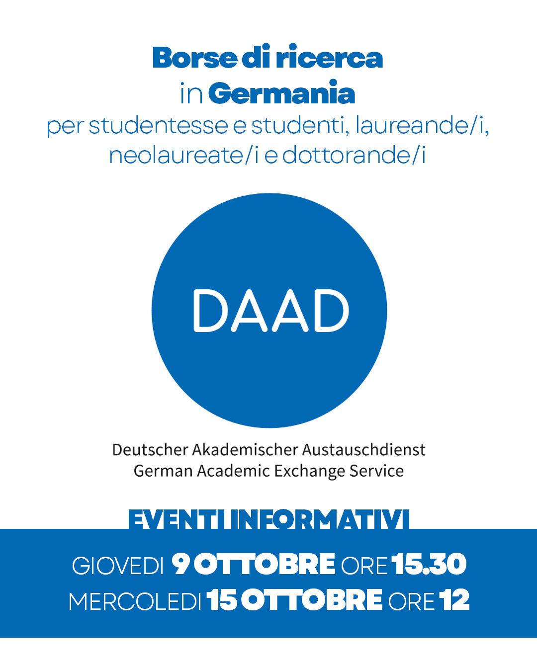 Per maggiori informazioni e per partecipare: https://www.daad.it/it/2025/09/25/studiare-in-germania-scopri-le-borse-di-studio-daad-e-partecipa-agli-eventi-informativi-online/