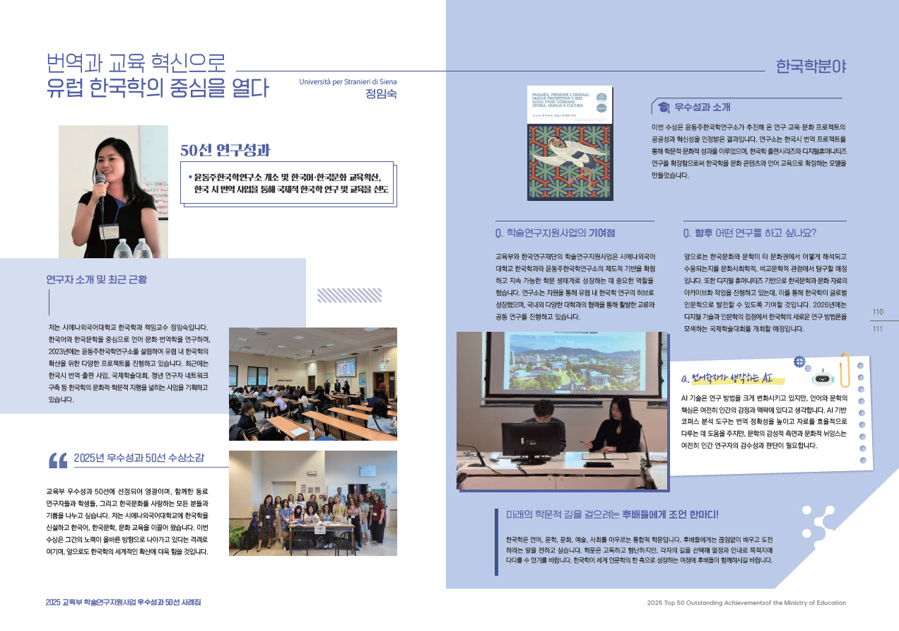 La professoressa Jung è rientrata in questo ristretto gruppo, diventando la prima studiosa nella storia della coreanistica in Italia a ottenere un riconoscimento di tale rilievo. La sua candidatura è stata sostenuta sia dal progetto di ricerca da lei diretto come PI (Direttore scientifico del progetto) — il Seed Program for Korean Studies, finanziato dall’Academy of Korean Studies — sia da una serie di pubblicazioni recenti da lei curate, tra cui: