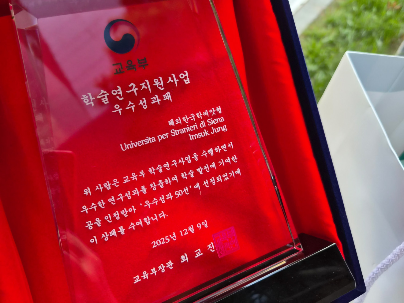 Il riconoscimento assegnato è il Ministerial Award for Outstanding Performance in the Academic and Research Support Program of Korean Studies (Premio del Ministero dell’Istruzione e della Ricerca per l’Eccellenza nel Programma di Ricerca e Sviluppo degli Studi Coreani).
