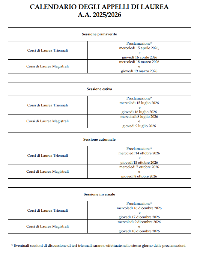* Eventuali sessioni di discussione di tesi triennali saranno effettuate nello stesso giorno delle proclamazioni.